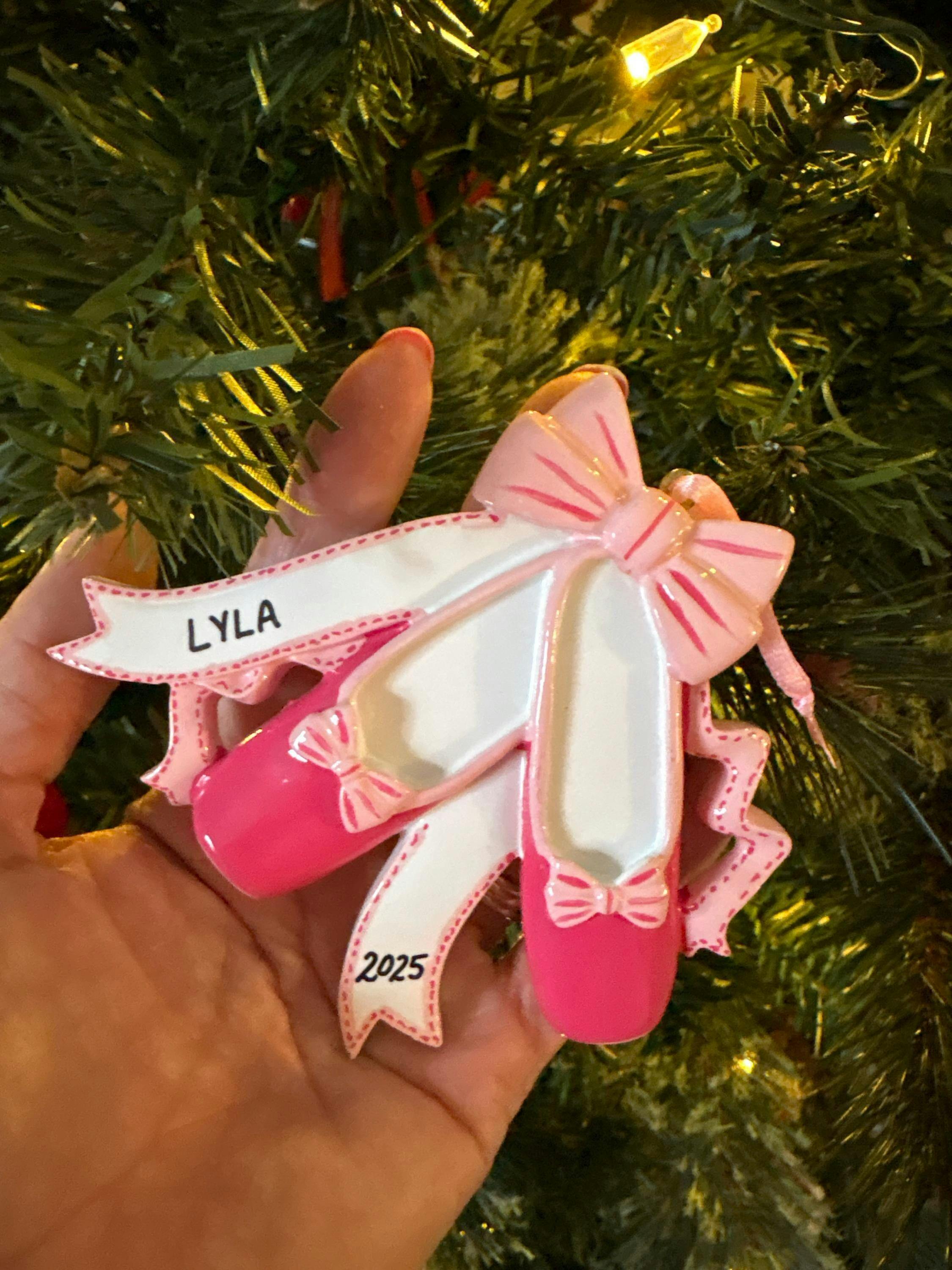 Make your little ballerina's dream come true with her own Personalized Christmas Ornament. Pink ballet shoes and a bow adorn our beautiful ornament. Ribbon has hot pink accent that will look great on your tree. A Perfect Holiday gift for your princess. It is a keepsake for your favorite one that will last a long time. Celebrate the Holidays, with a Personalized Ornament. Dibsies will add any name up to 9 Letters Max.