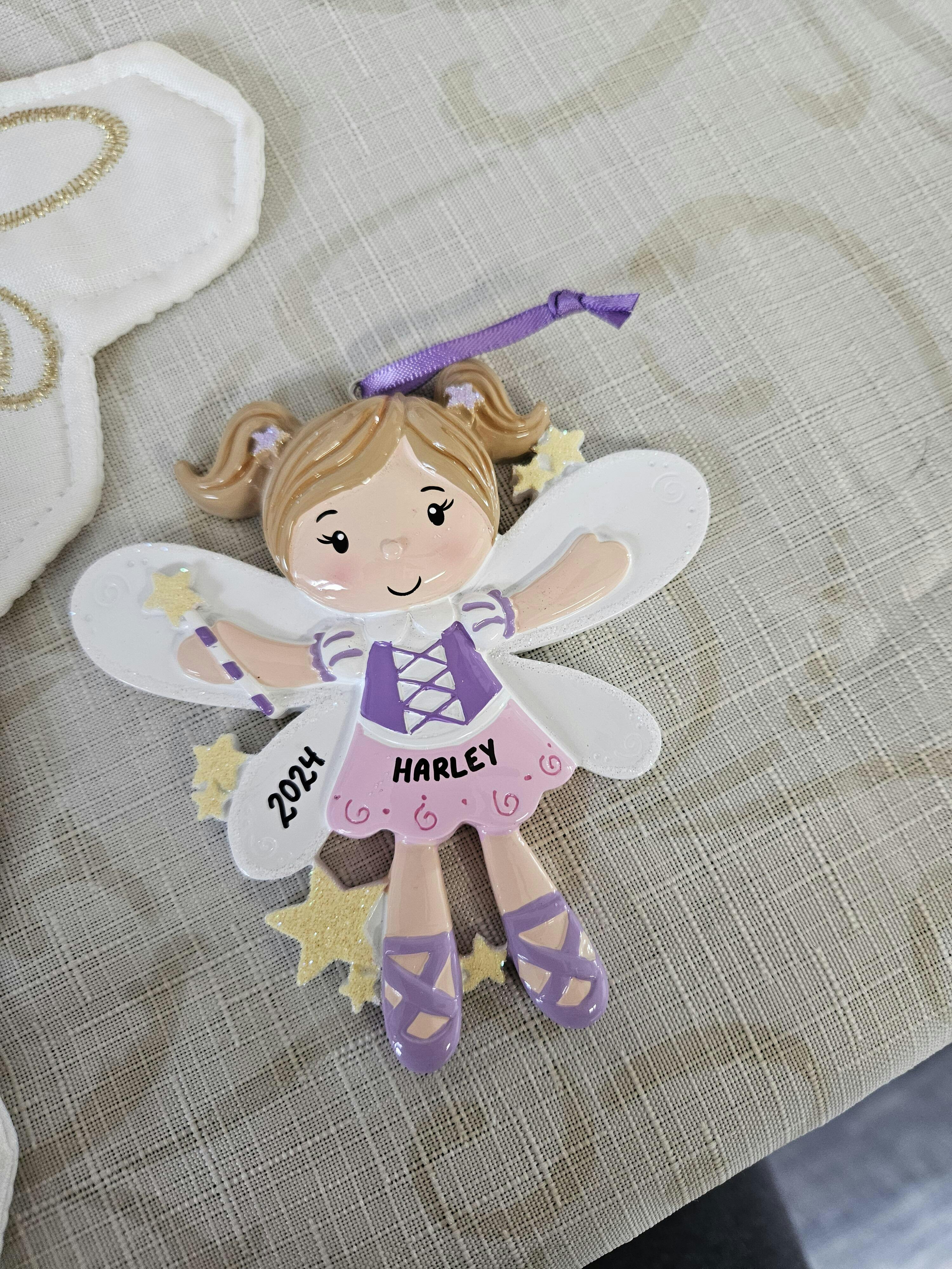 Make all of her Fairy dreams come true this Christmas with her Personalized Pink Fairy Ornament. Our design is highlighted with stars and a beautiful fairy with wings in soft pastel colors This Holiday season, gift your favorite little girl in the family with a Personalized Christmas Ornament. It is a keepsake for your little one that will last a long time. Celebrate the Holidays, with a Personalized Ornament. Dibsies will add any name up to 9 Letters Max.