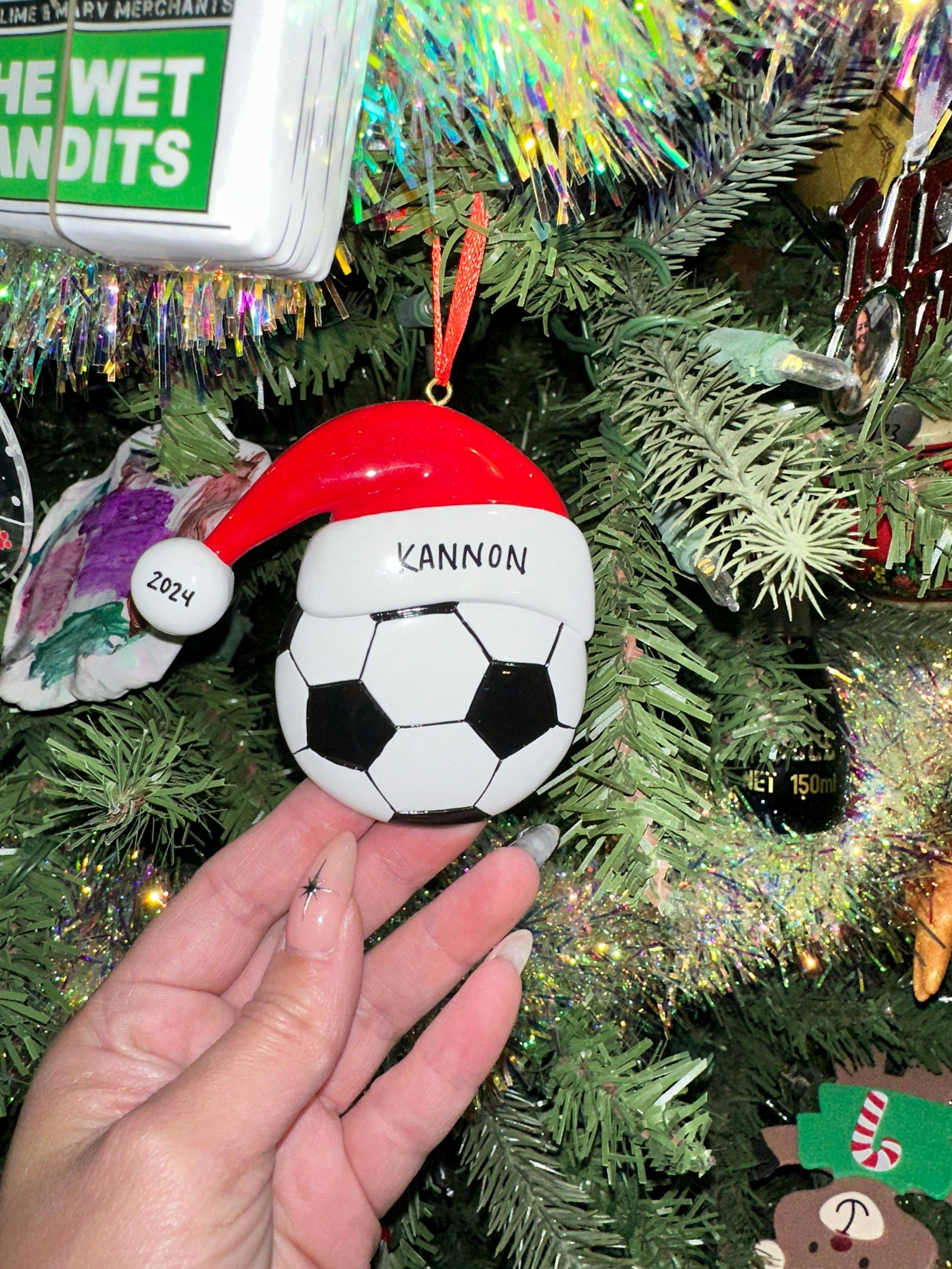 Score a goal this Christmas with your big soccer fan. Gift him with our Personalized Soccer Ball Christmas Ornament. Ribbon has red festive accent that will look great on your tree. A Perfect Holiday gift for your little athlete. It is a keepsake that will last a long time. Celebrate the Holidays, with a Personalized Ornament. Dibsies will add any name up to 9 Letters Max.