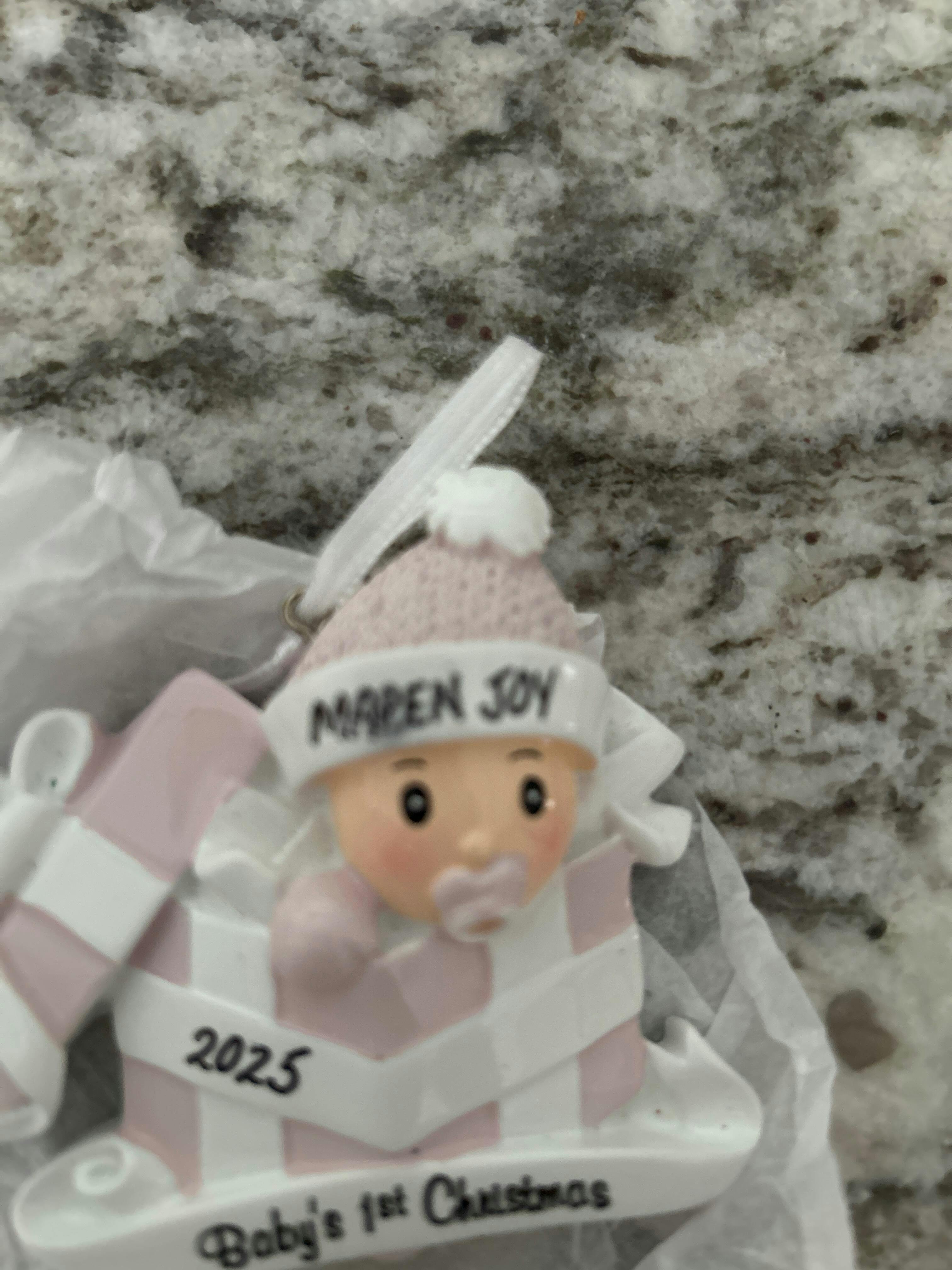 What a beautiful surprise! Our Baby in Present Ornament is too cute and a wonderful gift for the new parents. It is a keepsake for your little one that will last a long time. Celebrate the Holidays, with a Personalized Baby Christmas Ornament. Dibsies will add your baby's name up to 9 Letters Max.
