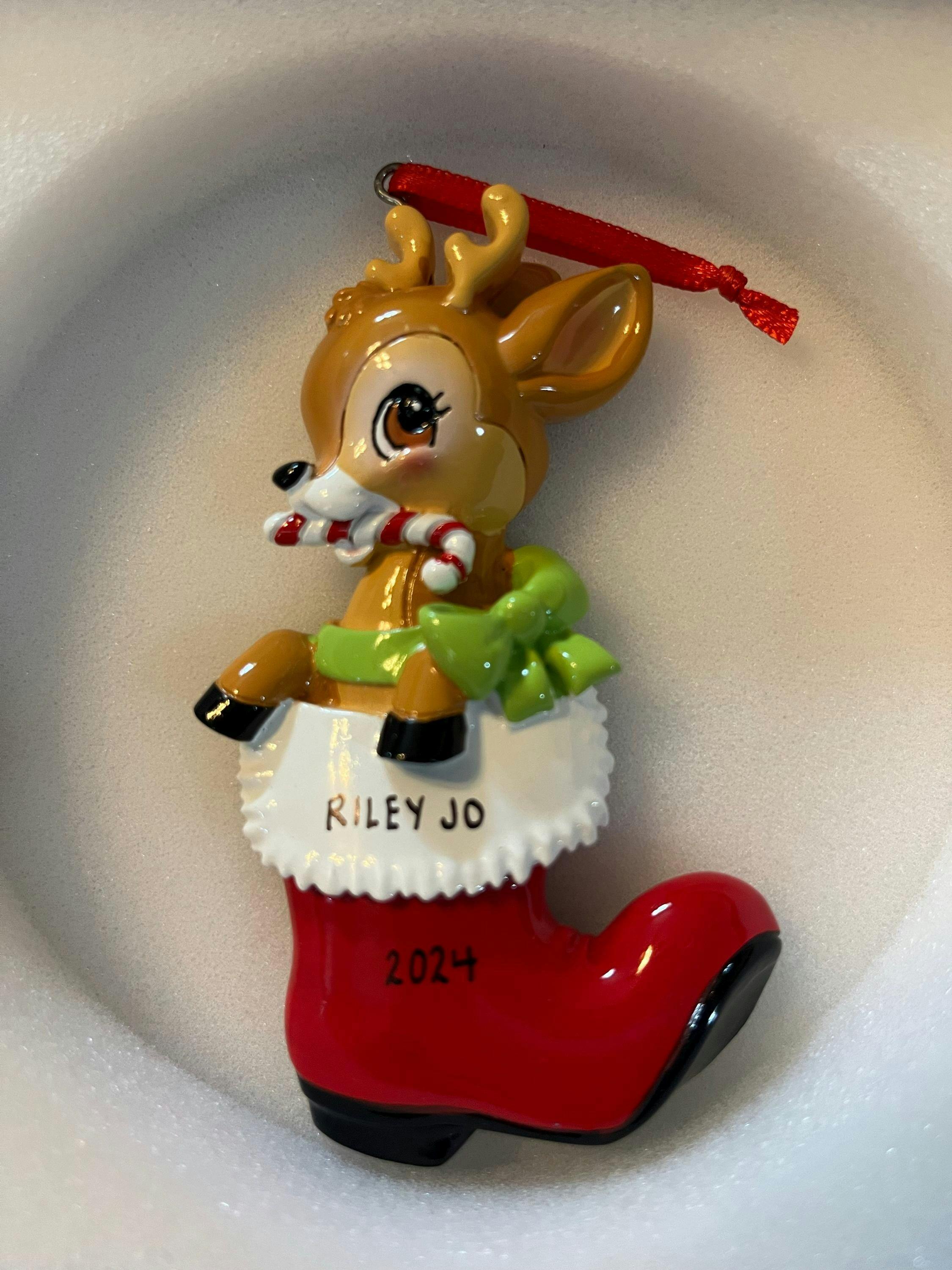 This cute baby reindeer will warm his way to your heart. A colorful ribbon and candycane adorn our ornament along with a big red boot. Our Baby's Ornament is a wonderful gift for new parents. It is a keepsake for your little one that will last a long time. Celebrate the Holidays, with a Personalized Baby Christmas Ornament. Dibsies will add any name up to 9 Letters Max.