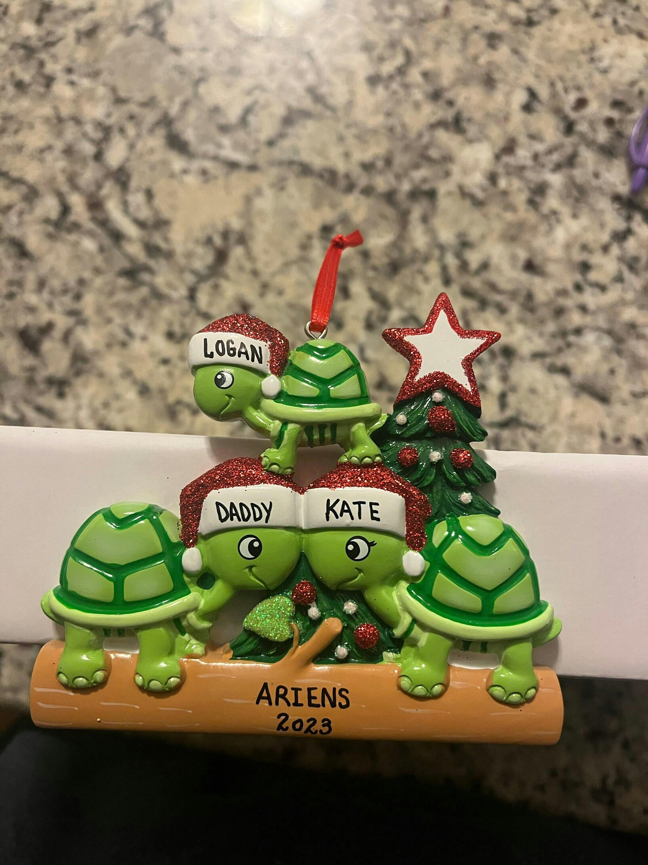 It's time to celebrate being with each other and decorate the tree with your very own Christmas ornament. Our cute and colorful Turtle Couples ornament is a wonderful addition to your holiday traditions. The green color is a real standout. This keepsake will be cherished and remembered for a long time. Dibsies will add your names  up to 9 Letters Max.