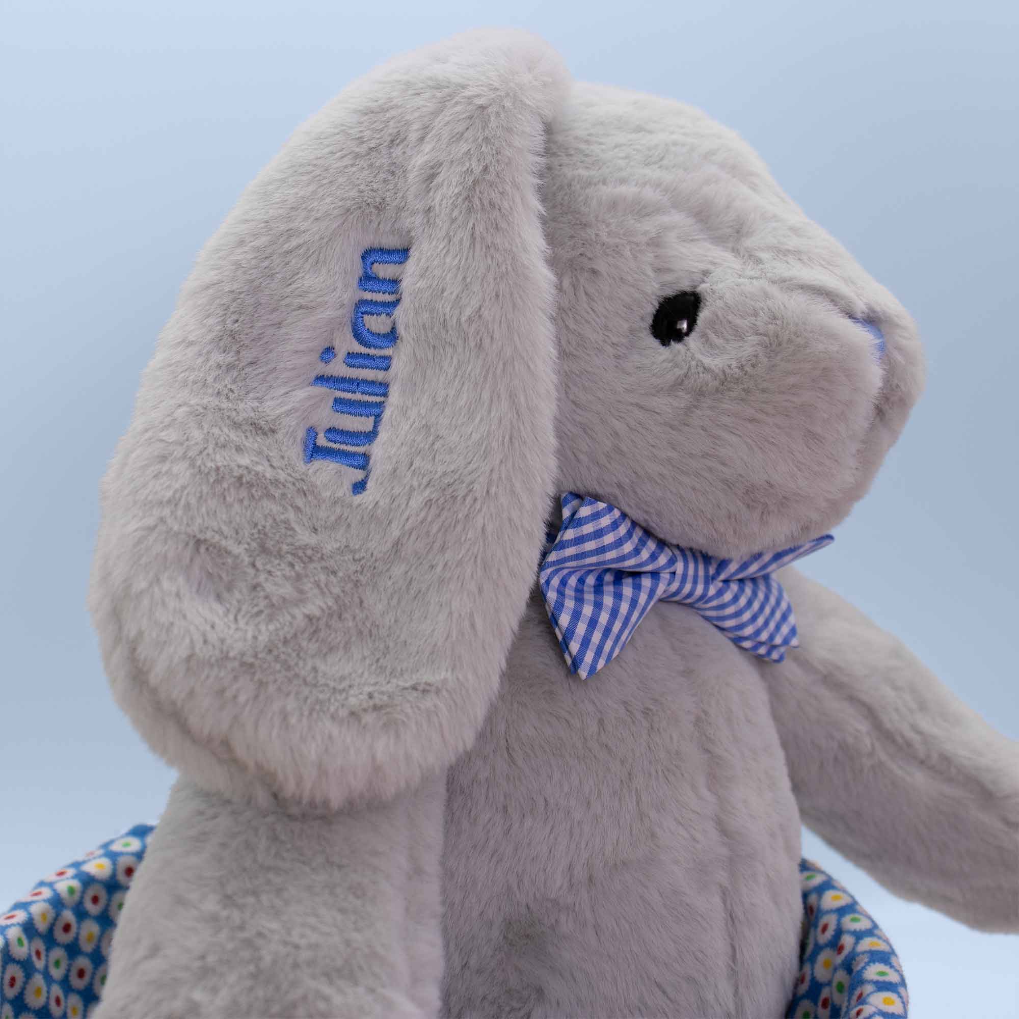 - Features oversize ears with a blue bowtie and embroidered blue nose.