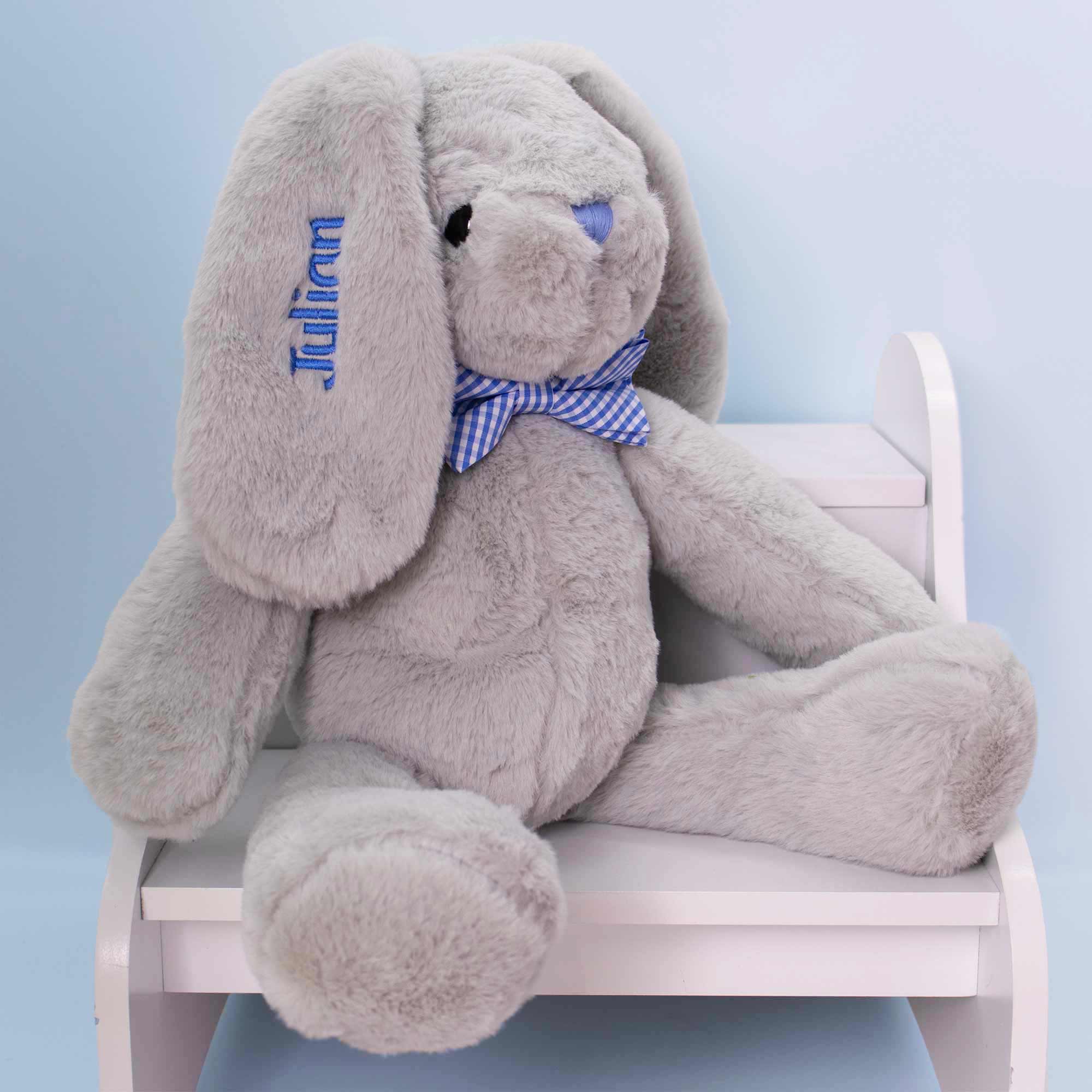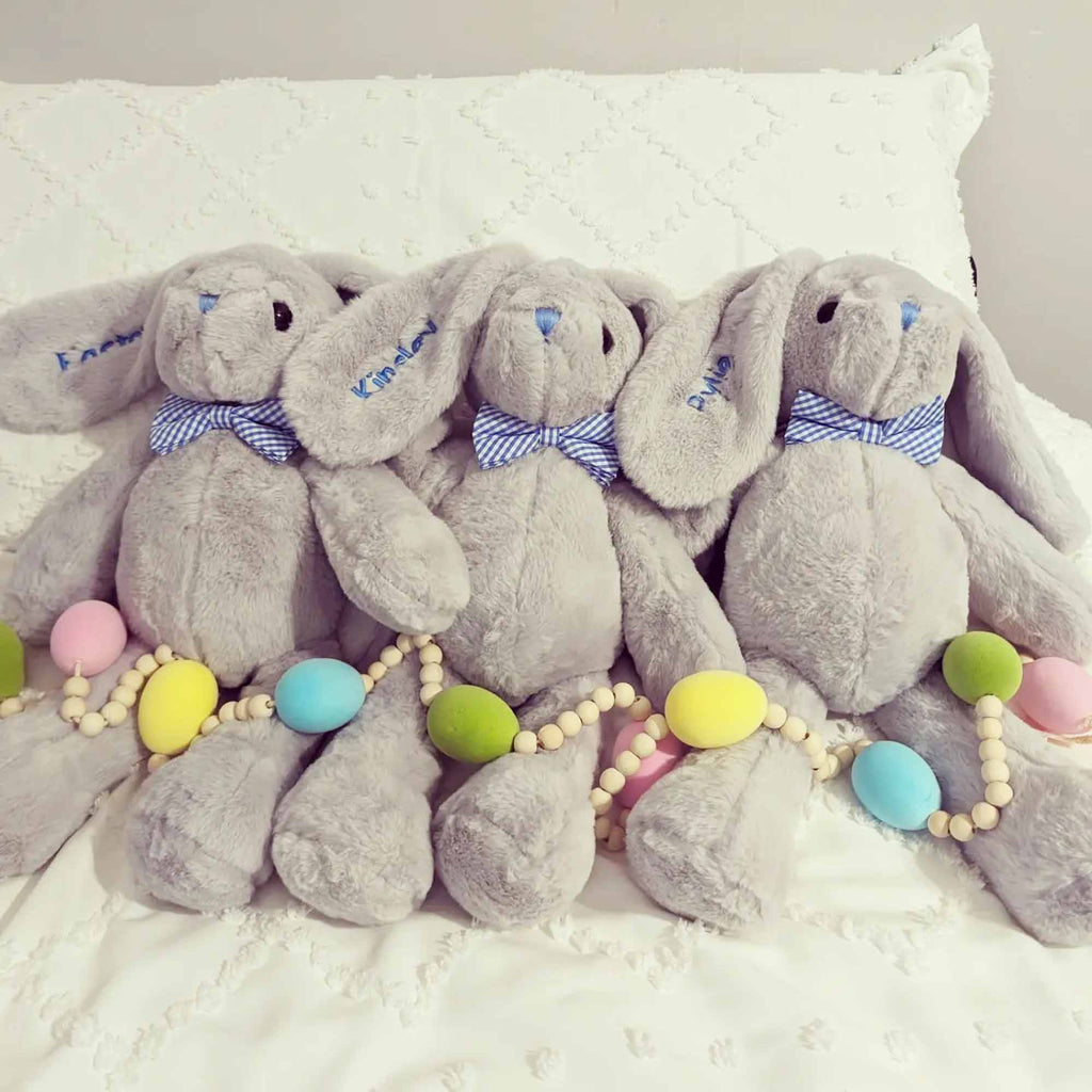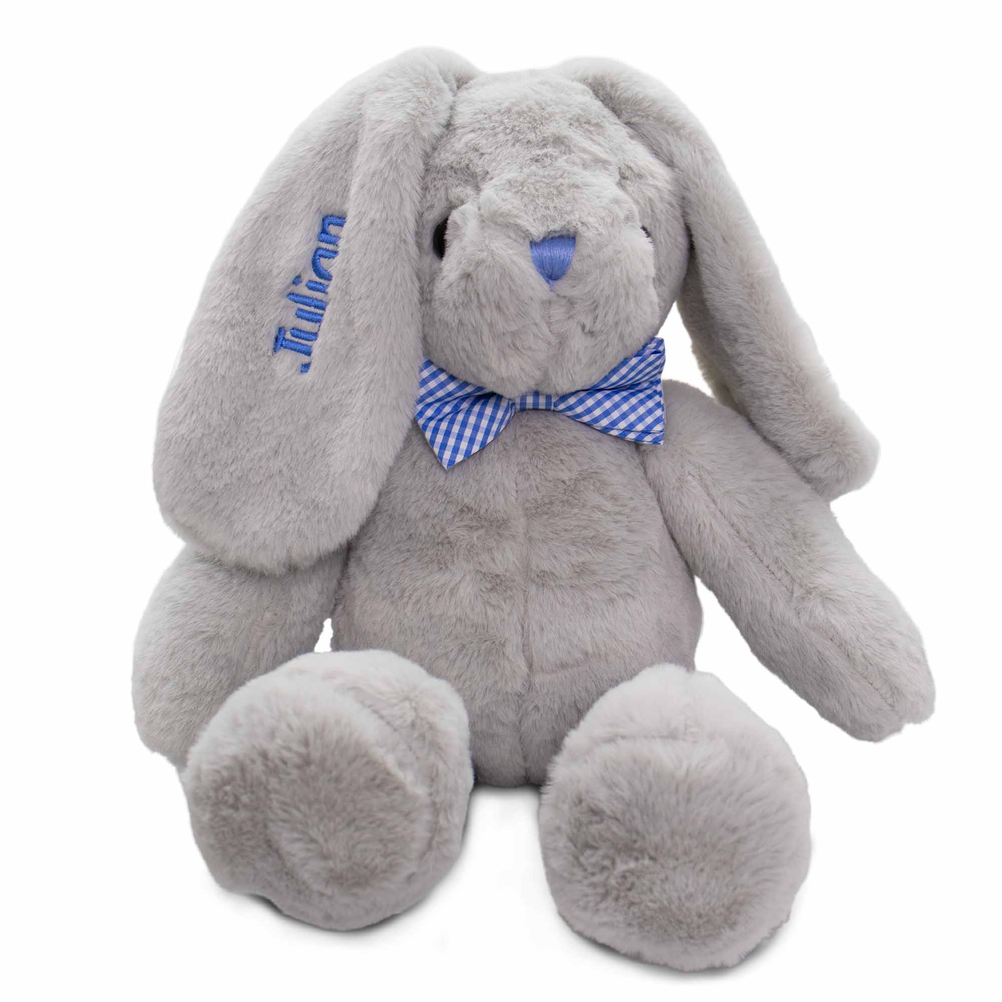 Our Hoppity Floppity Bunny will get lots of hugs and kisses from your little one. Cute and snuggly, our bunny features oversize ears, a plaid blue bowtie, and embroidered blue nose. This soft plush bunny has beautiful fur and measures 18 inches from the top of the head to the tip of the toe. A perfect addition to your Easter Basket.