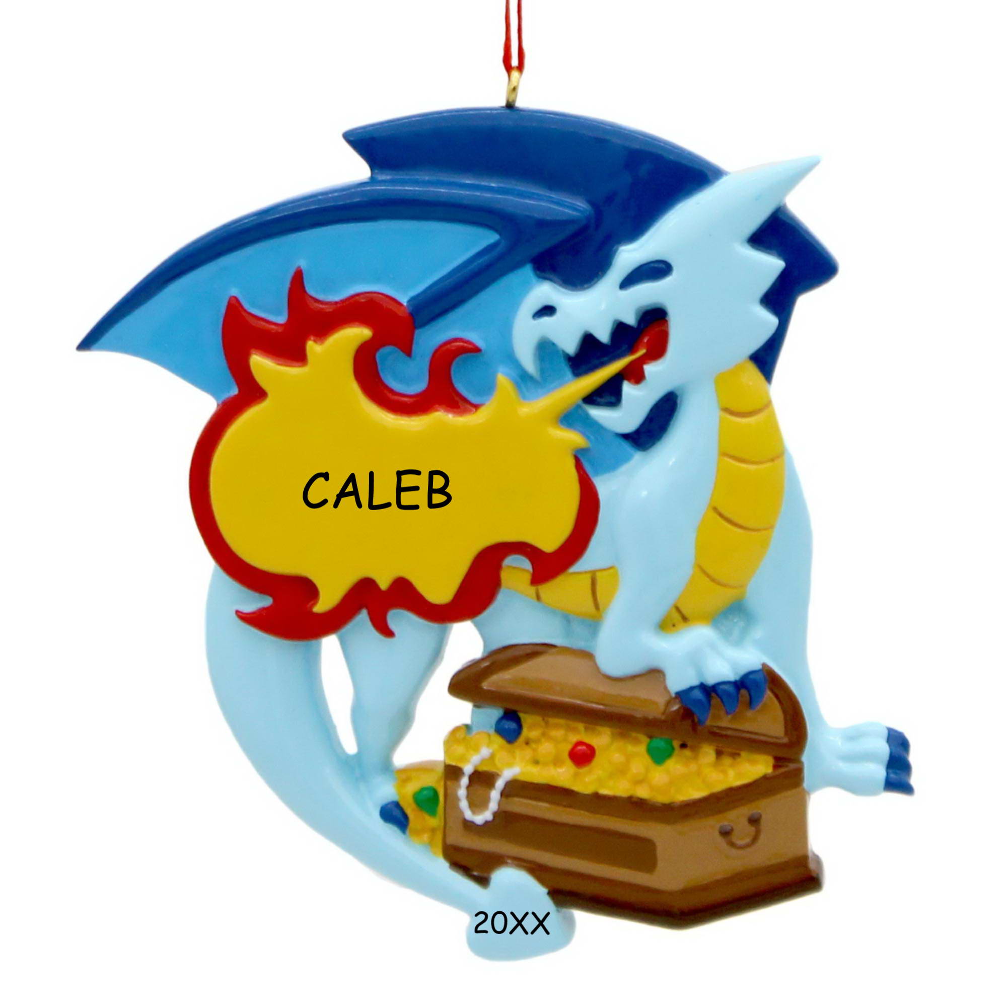 Here's a great gift for your young adventurer this Christmas. Our ornament is highlighted with a fire breathing dragon on top of a treasure chest. For that Little Boy/Girl who will someday be out there discovering new things. This is the perfect Ornament for them this Christmas. It is a real stand out on the Christmas Tree. This Holiday season, gift your favorite little boy/girl in the family with a Personalized Christmas Ornament. It is a keepsake for your little one that will last a long time. Dibsies will add any name up to 9 Letters Max.