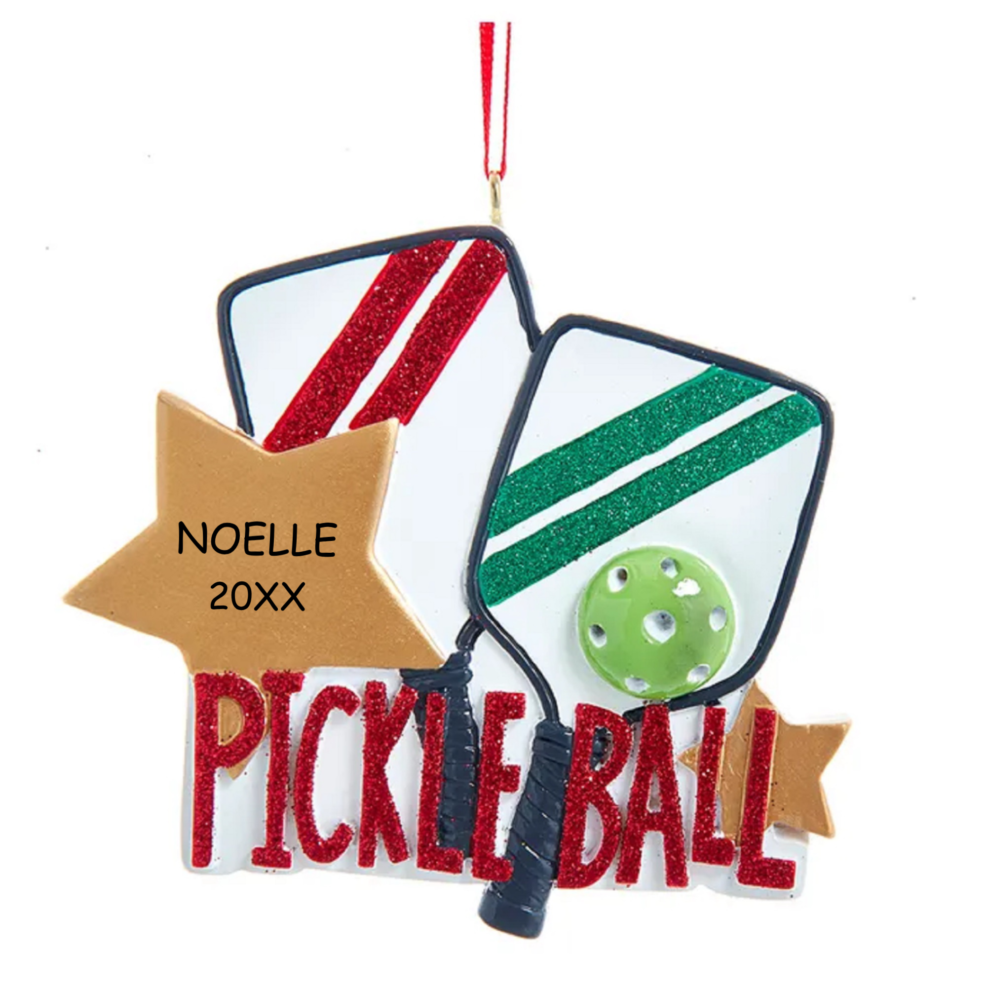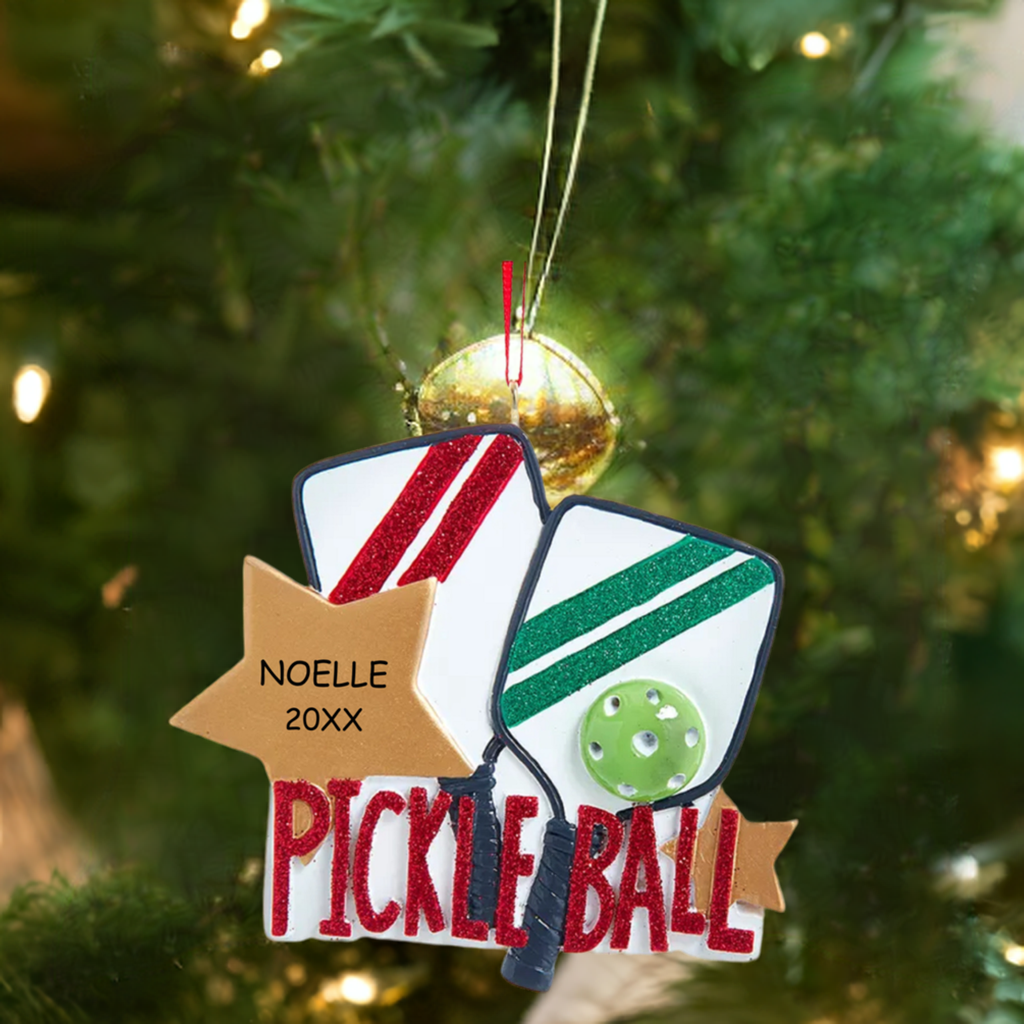 Gift your special one with this fun and festive pickleball ornament. Our design highlights a red and green paddle that will surely standout on your tree. Perfect gift for your avid player. It is a keepsake that will last a long time. Celebrate the Holidays, with a Personalized Ornament. Dibsies will add any name up to 9 Letters Max.